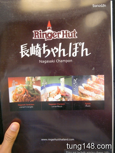 หน้าปกเมนู มีรูป 3 เมนูหลักของริงเกอร์ฮัท คือ นางาซากิ จัมปง, ซาราอูด้ง และ เกี๊ยวซ่า