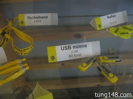ปากกา ราคา 2 kr, สายคล้องคอ ราคา 5 kr, USB ราคา 80 kr, ป้าย Reflex ราคา 10 kr, Postcard ราคา 1 kr