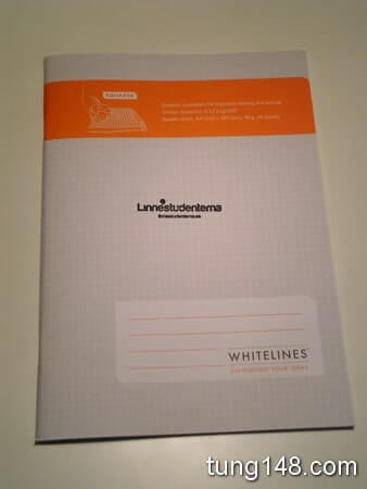 หน้าตาของสมุดเส้นขาว (Whitelines) ถ้ามองดีๆจะเห็นชื่อของ Student union (Linnéstudenterna) อยู่