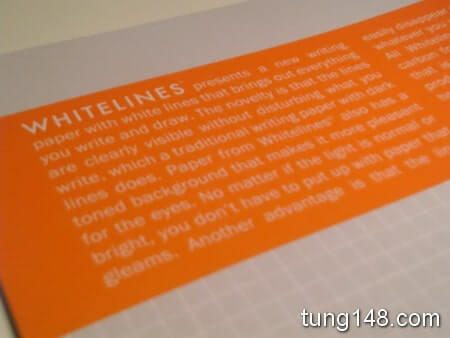 หลังจากได้สมุดมาแล้ว ก็ลองเปิดดู เอ๊ะ ทำไมมันแปลกๆ ที่ว่าแปลกคือ ทุกหน้าจะเป็นสีเทาอ่อนและจะมีเส้นสีขาวขีดเป็นช่องสีเหลี่ยมเล็กๆ คล้ายสมุดกราฟที่เราเคยเห็นกันต่างกันที่สีของกระดาษและเส้นเท่านั้น พอมาอ่านหน้าปกอีกที เค้าเขียนไว้ว่า “Swedish innovation for improved reading and writing” ถึงรู้ว่ามันเป็นนวัตกรรมใหม่ของสวีเดน สมุดที่ว่านี้มียี่ห้อว่า “Whiteline” งั้นของเรียกว่า สมุดเส้นขาวก็แล้วกัน อิอิ