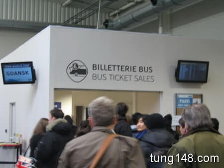 ลงจากเครื่องบินก็จะเจอที่ขายตั๋วรถบัสเข้าปารีสเลย ถ้าใครยังไม่มีเงินยูโรก็สามารถไปกด ATM ข้างนอกได้ เพราะมีที่ขายตั๋วด้านนอกเหมือนกัน