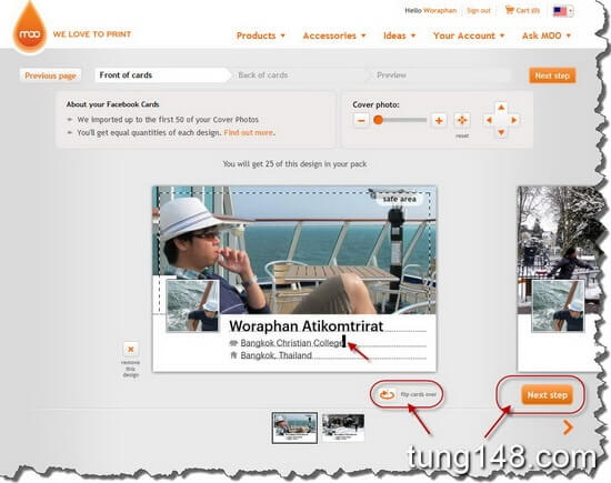 3. พอกดที่คำว่า Print Cards แล้วระบบก็จะขอสิทธิ์การเข้าถึงข้อมูลส่วนตัวของเรา ก็กด Allow ไป แล้วก็จะไปเว็บของ Moo ซึ่งเราจะเจอหน้าดีไซน์นามบัตร ที่ดึงมาจาก Facebook Cover ของเราแบบรูปด้านล่าง ซึ่งเราสามารถปรับแต่งแก้ไขได้ตามใจชอบทั้งด้านหน้าและด้านหลังของบัตร