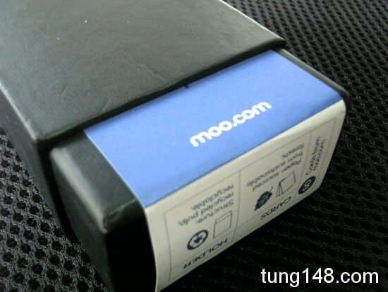 กล่องกระดาษสีดำที่ใส่นามบัตร เขียนว่ามาจาก moo.com