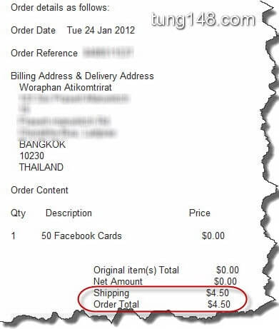 4. พอมาถึงหน้า Checkout ระบบก็จะบอกว่าเราได้นามบัตรแบบฟรี จำนวน 50 ใบแรก จากนั้นก็ไปกรอกข้อมูลที่อยู่ที่จะจัดส่งให้เรียบร้อย โดยสามารถเลือกวิธส่งได้ 2 แบบ คือ แบบเร็ว (Express) ก็จะแพงหน่อย คิดแล้วไม่คุ้ม ส่วนอีกแบบคือส่งแบบธรรมดาในเว็บเค้าเขียวว่าจะใช้เวลาส่งประมาณ 1 เดือน ซึ่งค่าส่งแบบธรรมดานี้เค้าคิดแค่ $4.5 เท่านั้นเอง คิดเป็นเงินไทยก็ประมาณ 135 บาทเท่านั้น ถ้าคิดเป็นราคาต่อใบก็ตกอยู่ที่ใบละ 2.7 บาทเท่านั้นเอง ถูกจริงๆ