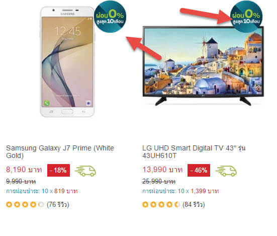 จะสังเกตเห็นสัญลักษณ์ว่าสินค้านี้ผ่อนได้ เช่น ผ่อน 0% สูงสุด 10 เดือน